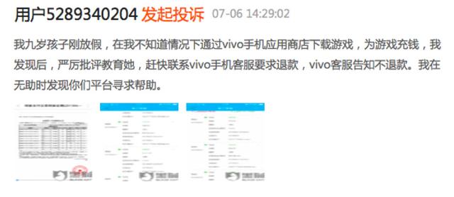 近日,在新浪黑猫投诉及21CN聚投诉上,有大量家长反馈自己的小孩通过vivo应用商店下载游戏,为游戏充钱。在被家长得知后,家长与vivo手机客服联系要求退款,vivo客服拒绝退款。