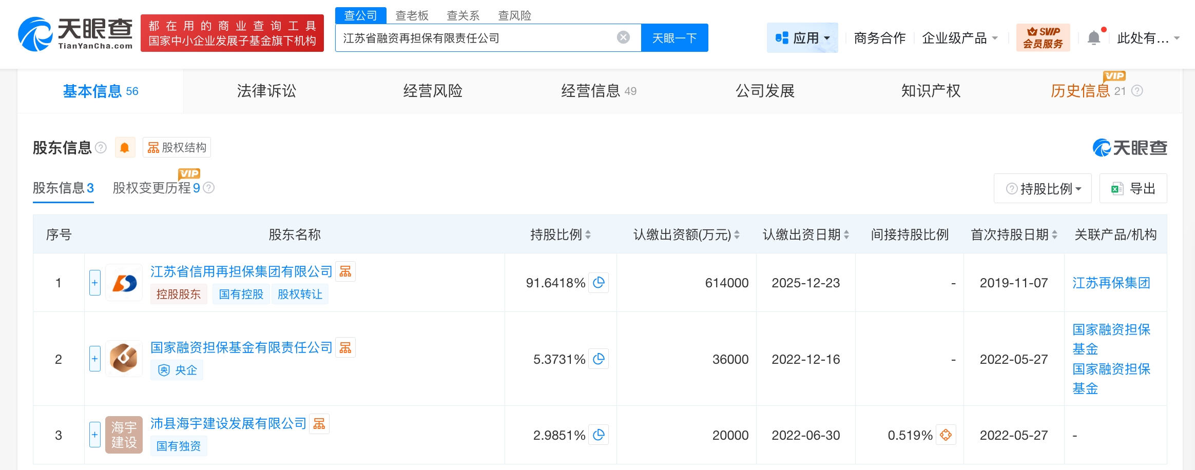 该公司成立于2019年11月,法定代表人为郭鸿雁,经营范围为融资再担保业务。股东信息显示,该公司由江苏省信用再担保集团有限公司、国家融资担保基金有限责任公司、沛县海宇建设发展有限公司共同持股。