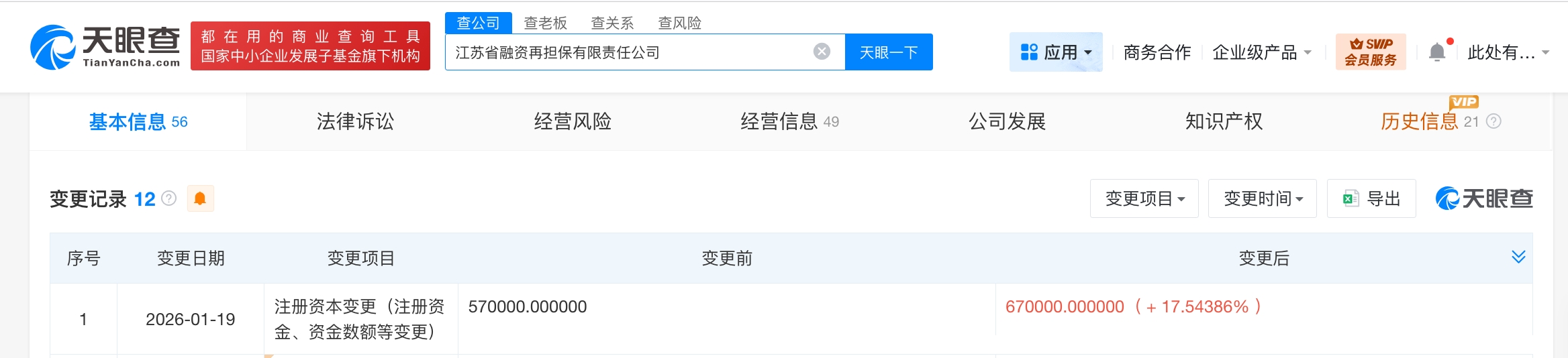 天眼查工商信息显示,近日,江苏省融资再担保有限责任公司发生工商变更,注册资本由57亿人民币增至67亿人民币,增幅约17.5%。