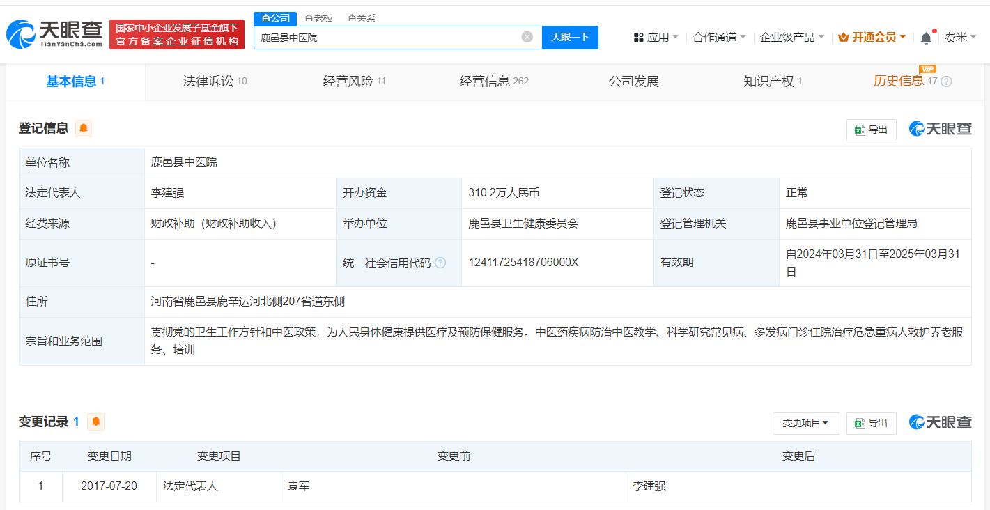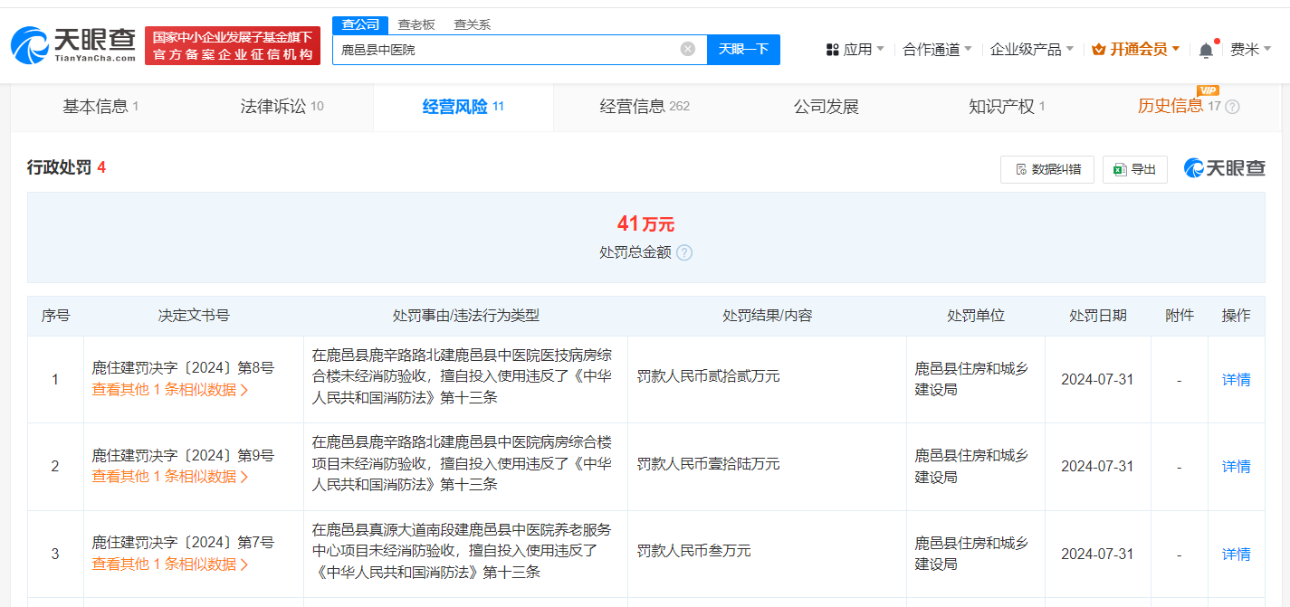 天眼查App显示,涉事鹿邑县中医院法定代表人为李建强,开办资金310.2万人民币,举办单位为鹿邑县卫生健康委员会,业务范围包括中医药疾病防治中医教学、科学研究常见病、多发病门诊住院治疗危急重病人救护养老服务、培训。经营风险信息显示,今年7月,该医院因医技病房综合楼、病房综合楼项目、养老服务中心项目未经消防验收擅自投入使用,被鹿邑县住房和城乡建设局合计罚款41万元。
