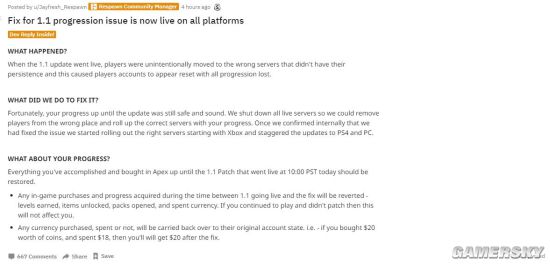 Apex官方发现这一问题后,这次更新的问题主要来自于玩家的档案被转移到了其他平台的服务器上,近乎崩溃的玩家们纷纷向Apex官方抱怨这一问题。