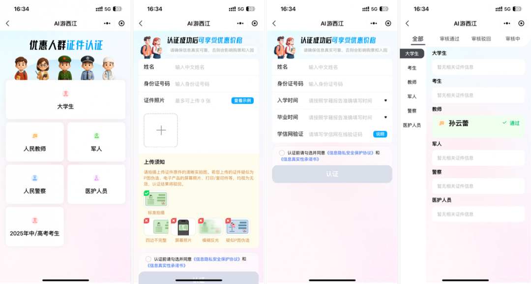本次升级的核心突破在于AI验票功能的开发与应用。针对景区优惠人群比例较高、传统人工核验面临的效率低下、防伪困难及易引发纠纷等长期痛点,马蜂窝首创“分级审核+异常行为识别”双机制,覆盖学生、教师等5类高频优惠人群。系统通过AI原件识别技术与实时拍照限制,有效拦截翻拍及P图等造假行为。设定现场游客优先审核策略,并增加自动核验占比,将人工抽检比例降至15%,实现核验效率3倍提升,保障票务安全的同时减少游客排队时长。