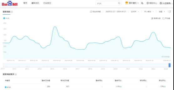 百度指数中,有关“AI PC”搜索量的整体日均值为293,移动日均值为107,整体环比下降了11%,移动环比下降17%。可见,AI PC在科技行业内正激起不小说水花,但国内的实际搜索量也并不高,且呈现下降的趋势。