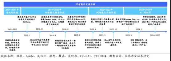 据《2024AI PC行业市场空间、竞争格局及全球龙头企业分析报告》,PC智能化发展已经历了“传统PC”、“PC智能化探索”、“PC智能化升级”与“AI PC时”代的四个发展阶段。