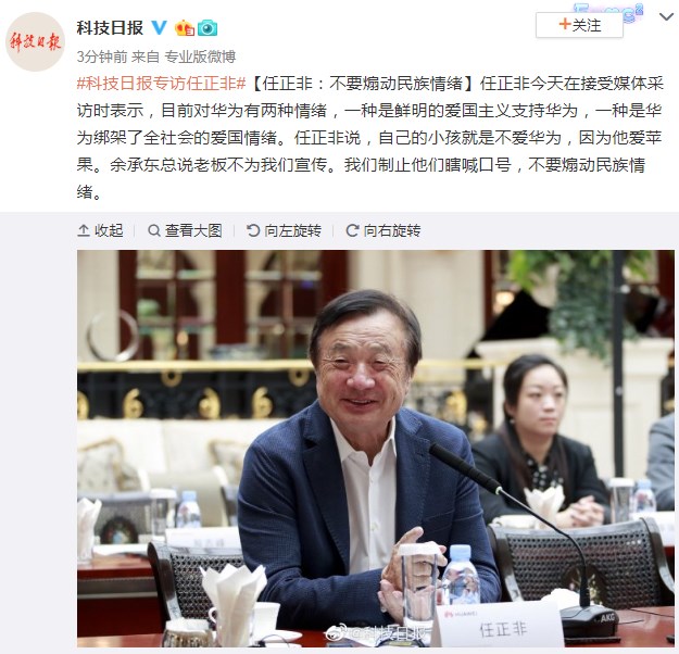 据科技日报报道,任正非今天在接受媒体采访时表示,目前对华为有两种情绪,一种是鲜明的爱国主义支持华为,一种是华为绑架了全社会的爱国情绪。任正非说,自己的小孩就是不爱华为,因为他爱苹果。余承东总说老板不为我们宣传。我们制止他们瞎喊口号,不要煽动民族情绪。