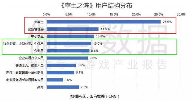 据伽马数据2019年下半年发布的报告显示,《率土之滨》的玩家结构以精英人群为主导,呈“高精尖”特征。游戏用户中,企业管理层、私企老板等人群占比,甚至超过了普通员工人群。除此以外,基于该群体的“职业精英化”,《率土之滨》用户平均月薪超过了1.4万元,远高于市场平均水平102%。