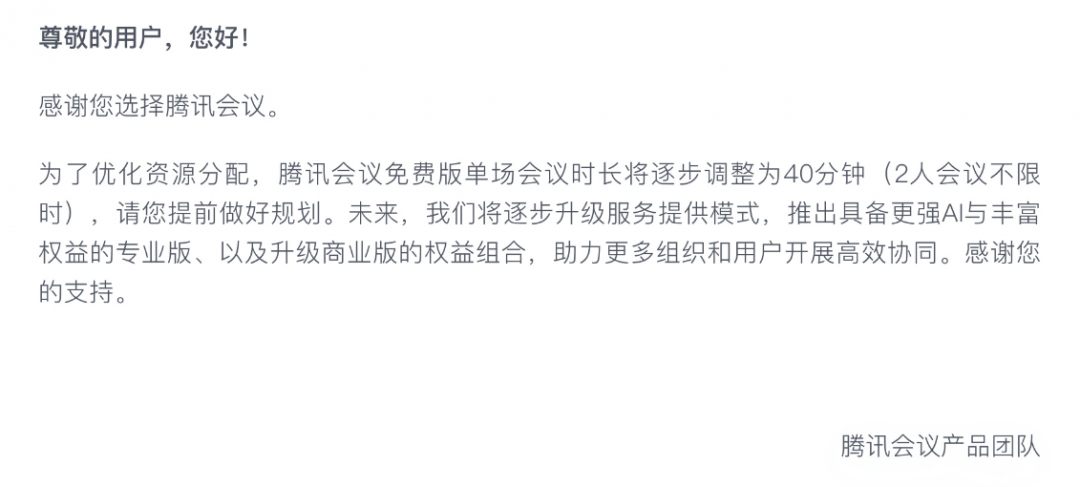 腾讯会议免费时长将缩短至40分钟 2人会议不限时