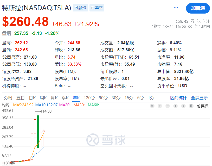 美股周四收盘,特斯拉股价涨21.92%至260.48美元,市值暴涨1500亿美元,达8321亿美元。据外媒报道,特斯拉股价创下11年来最大单日涨幅。