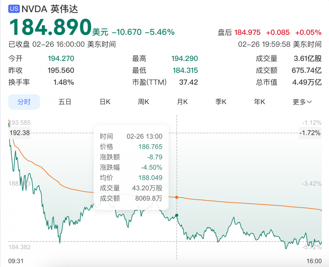 然而,强劲的业绩表现并未打消资本市场的担忧情绪。截至当地时间2月26日收盘,英伟达股价跌5.46%,创下近11个月以来最大单日跌幅。
