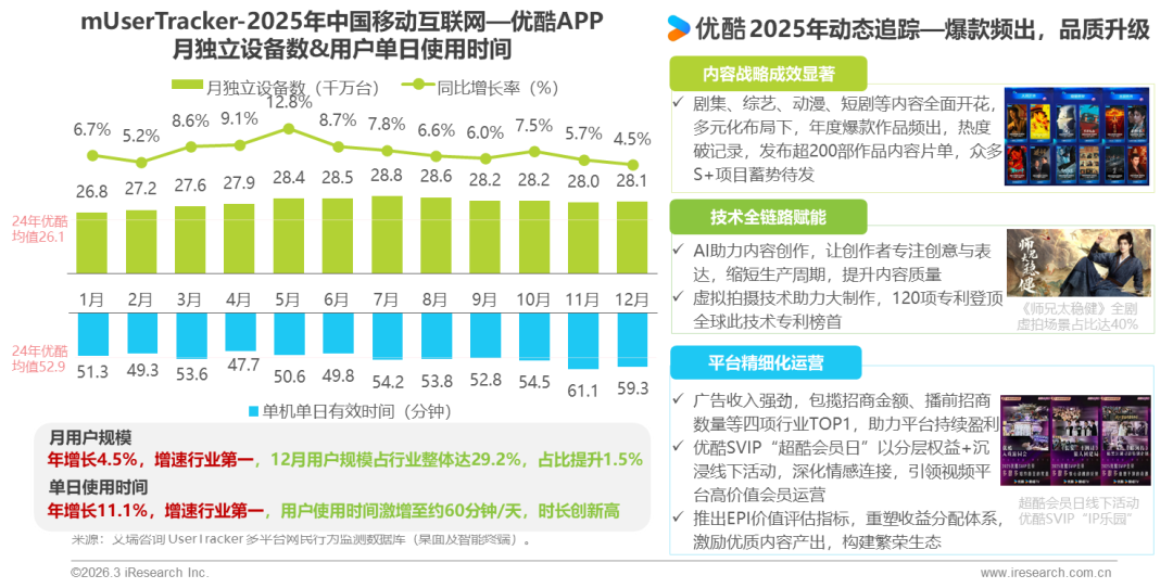 【TechWeb】3月12日消息,艾瑞咨询发布《2025中国移动互联网流量年度报告》。报告显示,受精品化战略驱动,2025年优酷APP用户规模同比增长4.5%,日均使用时长达60分钟、同比增长11.1%,两项核心指标增速均居行业首位。