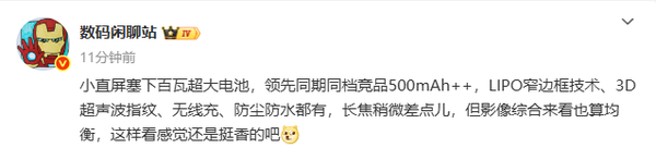 据知名数码博主@数码闲聊站 最新发布的信息显示,一款小直屏旗舰将内置超大电池+百瓦快充,领先同期同档竞品500mAh以上。同时还将采用先进的LIPO窄边框封装工艺,实现四边极窄的视觉效果,提升屏占比与操作体验。搭载3D超声波指纹识别技术,具备更快的解锁速度与更高的安全性。无线充电、IP68级防尘防水等旗舰功能也将悉数配备,长焦稍微差点儿,但综合影像能力比较均衡。结合此前相关爆料,该机很可能指的就是全新的小米16标准版。