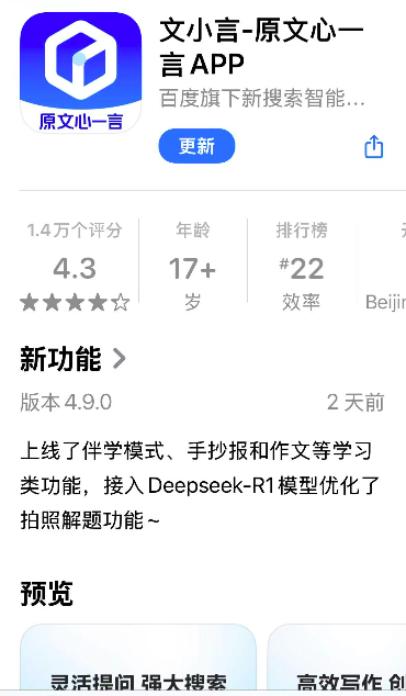 【TechWeb】2月11日消息,百度旗下文小言(原文心一言)App 近日发布版本更新,新版(4.9.0版)上线伴学模式、手抄报和作文等学习类功能,此外,该版本还接入 DeepSeek-R1 模型优化拍照解题功能。