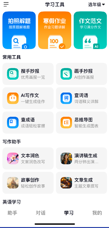 伴学模式下的文小言对话框主界面,“发现”栏变成了“学习”栏(如下图),点击“学习”可以有更多学习功能选择。