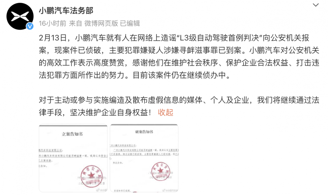 小鹏汽车:造谣“L3级自动驾驶首例判决”案已侦破,主要嫌疑人已到案汽车