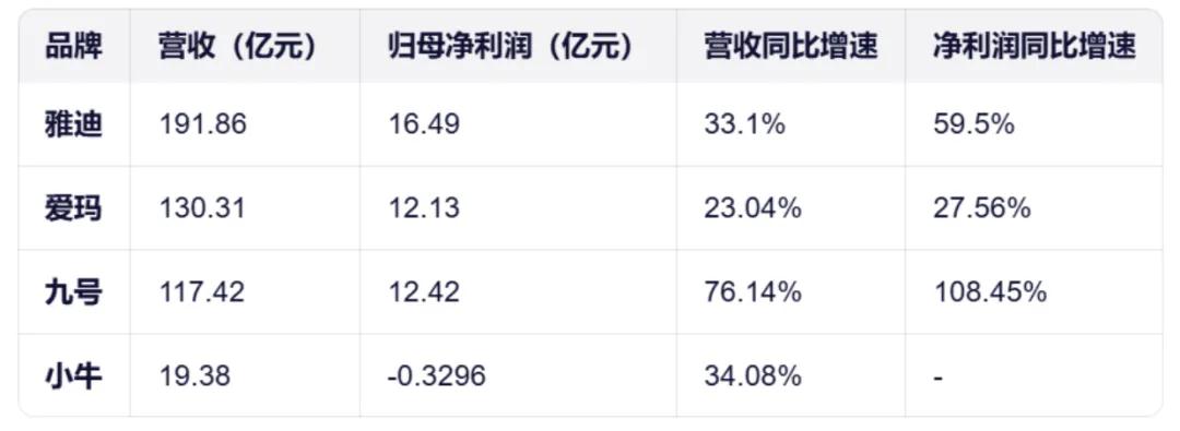 今年上半年,雅迪、爱玛在营收规模上依然保持领先,但在利润规模和增长速度上,九号这位“后来者”已经实现了关键反超。