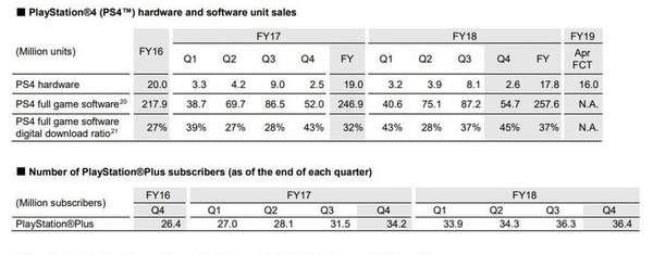 财报中显示,截止到2019年3月31日,PS Plus用户的数量超过了3640万,比上一财年增加了220万。PS4软件在2018年财年销量约为2.576亿份,其中数字版占比37%,上一财年则是32%。而财年第四季度的5470万份软件销量当中,有45%为数字版。