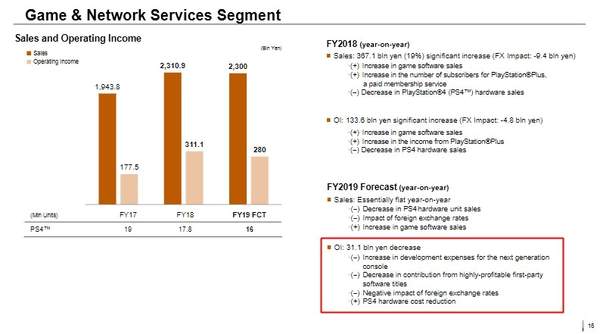 对2019财年的预期中,财报还提到游戏与网络服务部门会有利润下滑,显示为开发次世代主机的花费,以及第一方游戏的收益减少。