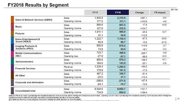 各个业务中游戏与网络服务部门继续大赚特赚,2018财年销售额为23109亿日元,营业利润为3111亿日元,与上一财年相比都有较大增长。而移动通信部门则是唯一一个亏损的业务,与2017财年一样营业利润为负,主要原因是智能手机销量的降低。
