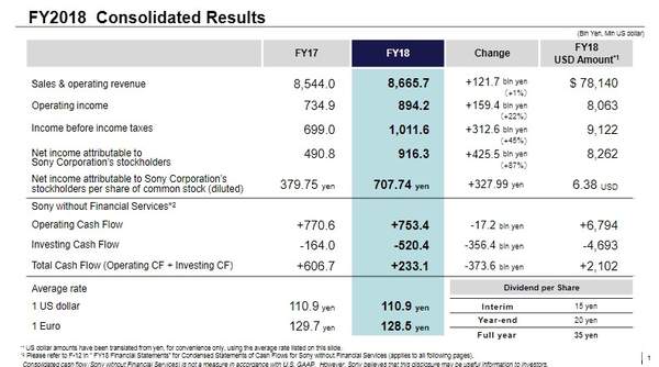 索尼今天公布了2018年全年财报,索尼集团在去年实现销售额约8.67万亿日元,营业利润同比增长22%,达到8942亿日元,净利润大涨87%,达到9163亿日元。官方表示这是继2017财年之后再创历史新高。
