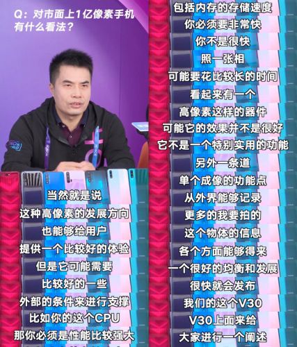 而同时,荣耀业务部副总裁(产品)熊军民在一个采访中针对市面上1亿像素手机发表了看法时也透露了一些荣耀V30的信息。他认为高像素是未来发展的其中一个方向,也能够为用户提供更好的体验。但是,1亿像素的摄像头需要外部条件的支持,比如性能强大的CPU、高速度的内存储存芯片等,不然会让拍照处理速度降低。而且高像素的摄像头未必能带来好的拍照效果,只有一些个别场景下才能用得上,不是一个特别实用的功能。