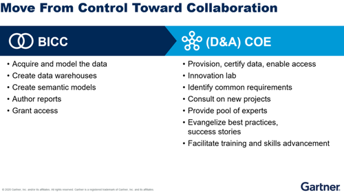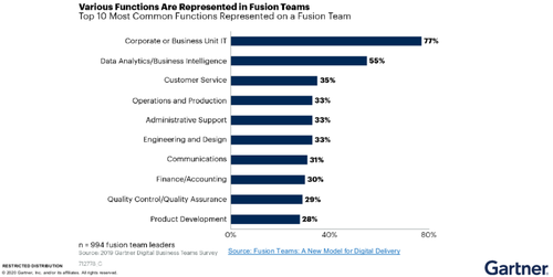 企业在渐进式数字化转型时面临的一个共同问题,他们各自为政,分别构建类似的解决方案,例如针对不同业务目的的数据分析模型,而这些模型具有共同的元素。在最好的情况下,这样做会造成重复,但更多的情况下,这也会增加复杂性,因为这样做会产生不同的点式解决方案,即使在单个业务内也无法沟通,更不用说在全公司的业务价值链上了。从这个角度来看,Gartner更推荐企业把数据中台定性成一个组织战略,把数据分析团队作为数字化平台建设必备的一个元素。Gartner也在2019年的《Gartner 数字化业务团队问卷》中发现,数据分析/商业智能是融合团队(Fusion team)中除IT以外最常见的功能。