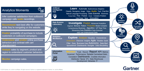 分析时刻是Gartner定义的一种数据分析流程,通过对数据进行可视化、探索和应用算法,支持业务成果的交付,从而做出更好或更快的决策,实现业务流程的自动化。在这个例子中,数据分析能力(最右侧)是被逐步建立起来的,他们的背后有大量的厂商可以被选择,这些能力可以多大程度的被其他分析时刻复用,多低的门槛可以被业务应用,直接决定了数据中台的成功。其中厂商的能力可以通过Gartner每年数据分析领域的九张《魔力象限(Magic Quadrant)》及配套的《关键能力(Critical Capability)》报告进行评估。