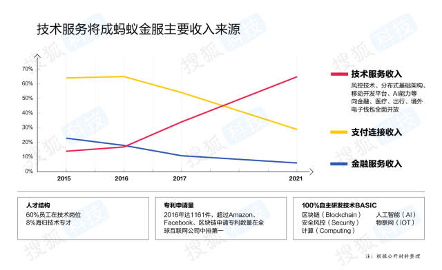 这两大业务战略方向的背后,都来自于技术的驱动。据之前流传出蚂蚁的一份融资文件中统计,因此,预计在2021年,蚂蚁金服的三大收入来源中,“技术服务收入”将从现在的30%大幅升至65%以上。