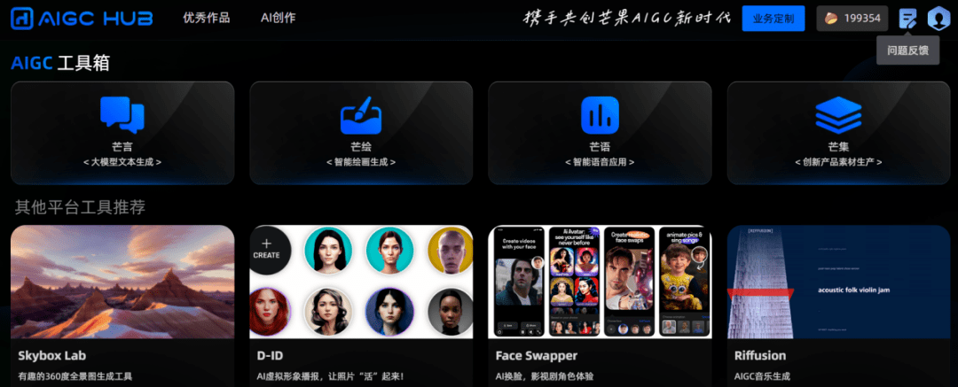 AIGC HUB集成了领域模型、AI绘画、语音生成等文本、图像、语音模态的AIGC能力。根据芒果TV官方的说法,希望通过“全民”共建、“全民”共用的方式将AIGC的能力浸润到内容生产、互动运营、宣传推广、广告营销等生产细节中,期望通过大规模深入的应用激发各业务场景的创新创意,携手共创芒果AIGC新时代。