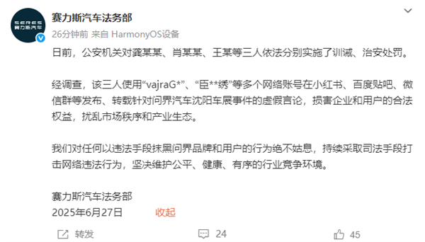 赛力斯汽车法务部通报:散布虚假信息者受到法律制裁汽车