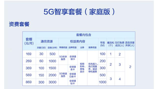 中国移动5G套餐家庭版也分为5档,169元/269元/369元/569元/869元,具体套餐详情如下: