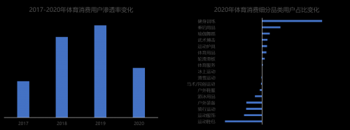 在国家促进全民健身和体育消费的政策推动下,体育市场的活力和体育消费的热情不断被激发,经常参加体育锻炼成为很多人的一种生活方式。2017-2019年,线上体育消费的用户渗透率持续提升,2020年受到新冠疫情的影响,一些群体项目难以展开,渗透率有所下滑。