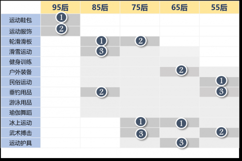 其中,85后(26-35岁)最偏爱:轮滑、垂钓和滑雪;75后(36-45岁)最偏爱:冰上、轮滑和武术搏击;65后(46-55岁)最偏爱:冰上、户外和运动护具;55后(56以上岁)最偏爱:民俗运动(毽子、响鞭、拔河、空竹等)、武术搏击和垂钓等相关用品。