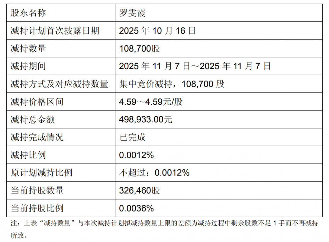 11月7日,永辉超市副总裁罗雯霞通过集中竞价方式减持股份10.87万股,占公司总股本0.0012%,减持价格为4.59元/股,减持总金额近50万元。
