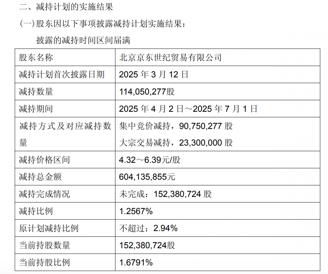 7月3日,永辉超市发布公告,股东北京京东世纪贸易有限公司于2025年4月2日至7月1日间合计减持1.14亿股,占公司总股本的1.2567%,减持价格区间为4.32元/股至6.39元/股,减持总金额超过6亿元。