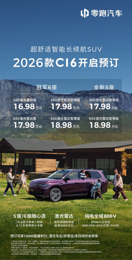 新增全新5座版,配置续航全面升级 2026款零跑C16开启预售:16.98万起汽车
