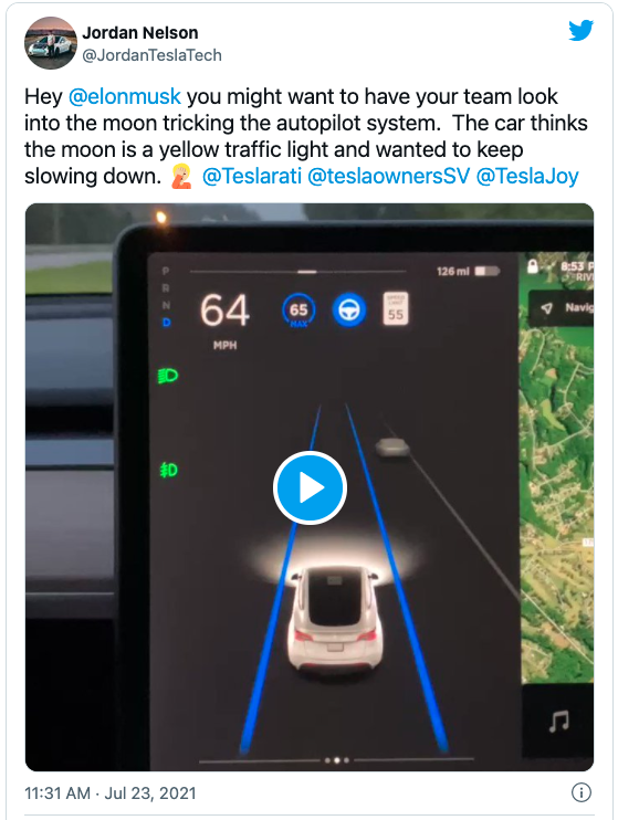今年7月份,一条疯传的推文显示,一辆特斯拉汽车在高速公路上行使时一再地将月亮误识别为黄色交通信号灯。