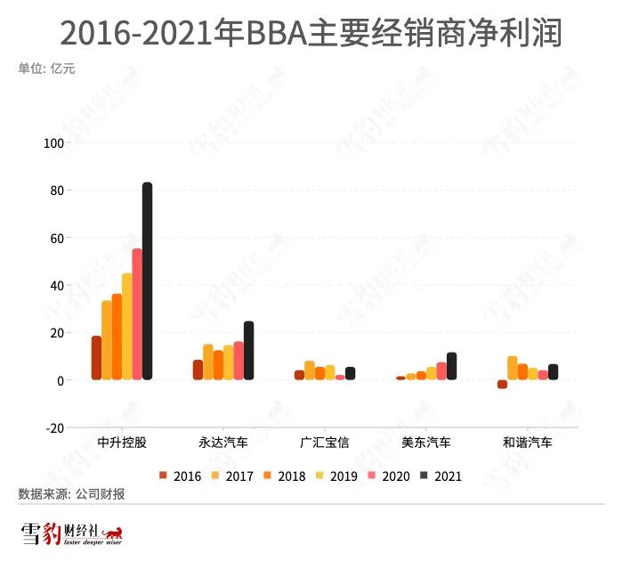 2021年,奔驰第二大经销商中升控股实现净利润83.29亿元,同比增长50.35%,高于广汽、长城和比亚迪等一众头部车企。是年,该集团在国内奔驰品牌的市场份额约为18%。