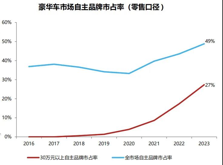 张峰所感受到的最强力冲击,来自于自主品牌。据东吴证券统计,自主品牌凭借在智能化和电动化领域的优势,自2021年起在30万元以上市场的市占率持续提升。2023年,自主品牌在豪华车市场市占率达到27%,BBA的市占率则下滑至45%。