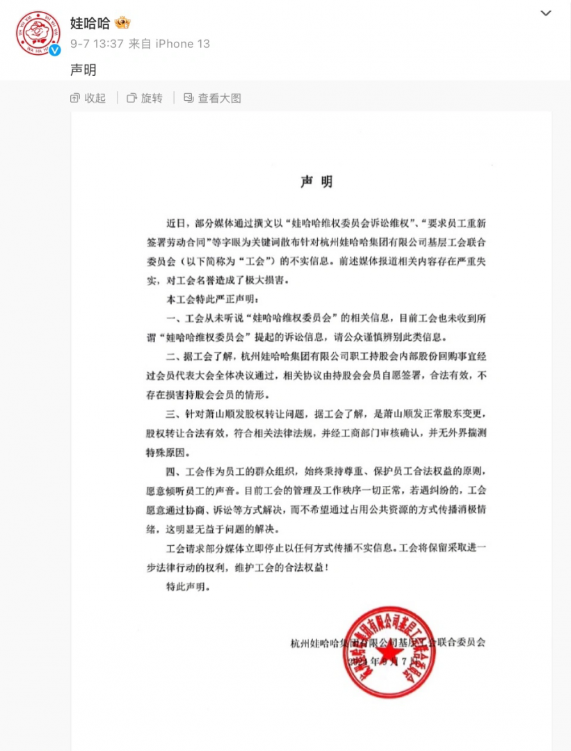 9 月 7 日,娃哈哈在微博发布声明,否认了“要求员工重新签署劳动合同”一事,工会从未听说“娃哈哈维权委员会”的相关信息,目前工会也未收到所谓“娃哈哈维权委员会”提起的诉讼信息。