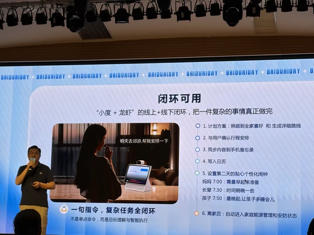 在百度AI DAY活动上,百度正式发布全球首款“家用小龙虾”——小度龙虾。该产品将OpenClaw复杂任务能力引入家庭空间,让AI Agent从手机和电脑中走出来,成为全家人随时可以调用的家庭助手。