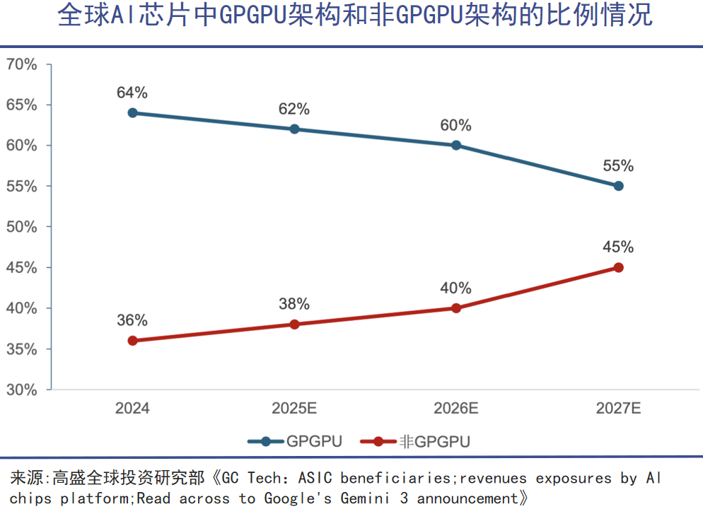 谷歌在Gemini3大模型就采用自研的TPU训练完成,打破了英伟达的垄断,而亚马逊、META 和微软等均在自研非GPGPU架构芯片。高盛就预计未来非GPGPU的占比将逐步抬升,这也是当前英伟达股价承压的一大原因。
