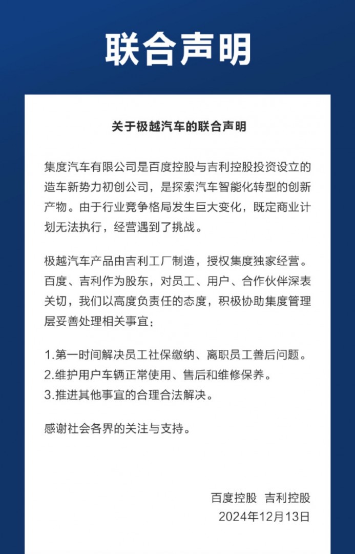吉利和百度发表刚刚关于极越汽车的联合声明,作为股东,将积极协助集度管理层妥善处理相关事宜:第一时间解决员工社保缴纳、离职员工补偿问题;维护用户车辆正常使用、售后和维修保养;推进其他事宜的合理合法解决。