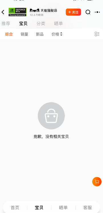 TechWeb发现,通过淘宝App搜索“英伟达GeForce旗舰店“后,该旗舰店”宝贝“一栏确实空白。对此,该旗舰店客服在回复TechWeb时表示:本旗舰店仅用于展示包含英伟达 GeForce品牌的终端产品,并不出售任何产品或服务,相关产品信息请以跳转后的店铺所发布的信息为准。