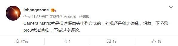 据网友透露,Camera Matrix的中文意思是“多维相机矩阵”,主要是描述摄像头排列方式的,在外观上将继续剑走偏锋。据他表示,该机将有望采用类似于此前亮相的坚果Pro3的摄像头排列方案。值得注意的是,坚果Pro3也并不是第一款采用该方案的手机,三星不久前推出的Galaxy M30s同样采用这样的设计。只不过此次荣耀V30可能并不会局限于排列方式的层面,应该在底层技术上也有非常值得期待的地方。