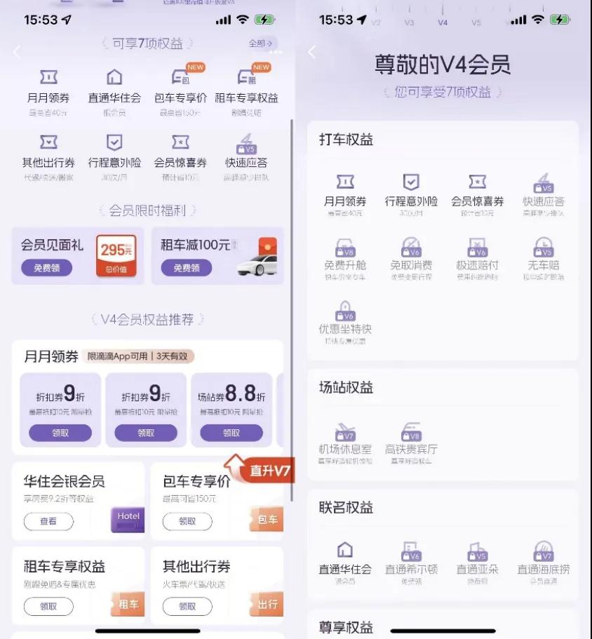 面向对价格敏感的普通用户,其将原来属于高等级会员的“快速应答”“免取消费”等优享出行体验下放到V5-V6级会员,实现会员权益的提质扩容;面向高净值会员,其新增了高峰叫车、酒店免费早餐、行政酒廊等权益,让商务出行群体有更大的“获得感”。