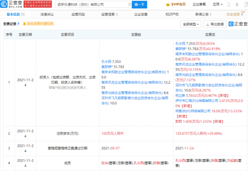 【TechWeb】企查查APP显示,11月24日,奇梦乐通科技(深圳)有限公司发生工商变更,新增网易(杭州)网络有限公司等多名股东,同时公司注册资本由100万元人民币增加至120.6757万元人民币,增幅为20.68%。