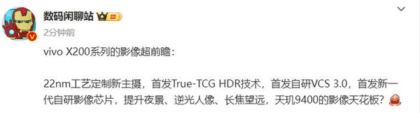 【TechWeb】据此前相关爆料,高通新一代旗舰移动平台骁龙8 Gen4将有望提前在今年10月发布,相关终端的上市节奏随之也将提前,不出意外的话,全新的小米15系列有望再次拿下首发权。而除了高通之外,联发科也计划于今年10月推出其新一代旗舰级移动平台——天玑9400,硬刚骁龙8 Gen4,其首发机型则将是全新的vivo X200系列。现在有最新消息,近日有数码博主进一步晒出了该机在影像上的更多新技术。