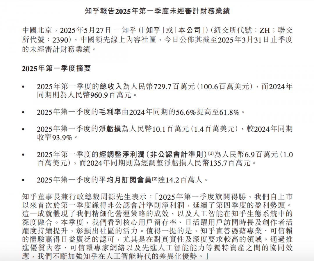 知乎2025年一季度经调整净利润694万元 连续两个季度盈利快讯