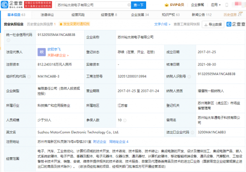 企查查信息显示,裕太微电子是一家车载核心通讯芯片研发商,公司成立于2017年,法定代表人为欧阳宇飞,经营范围包含:电子、汽车、工业自动化、计算机领域的技术开发、技术咨询、技术服务、技术转让等。