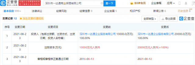 【TechWeb】企查查APP显示,8月23日,深圳市一达通商业保理有限公司发生工商变更,公司注册资本由1亿元人民币增加至2亿元人民币,增幅为100%。